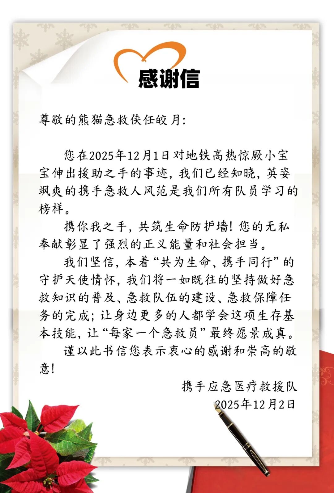 携手急救团队大力弘扬见义勇为精神,营造见义众为、见义智为的浓厚社会氛围,凝聚更加强大社会正能量。