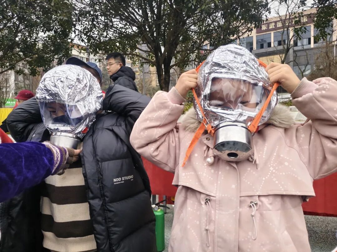 老师现场演示自救呼吸器的佩戴步骤:“先拔插销、再罩住口鼻、最后拉紧头带”,手把手教居民找准贴合角度;讲解灭火器 “提、拔、握、压” 动作时,特意放慢节奏,让大家看清每一个发力细节。
