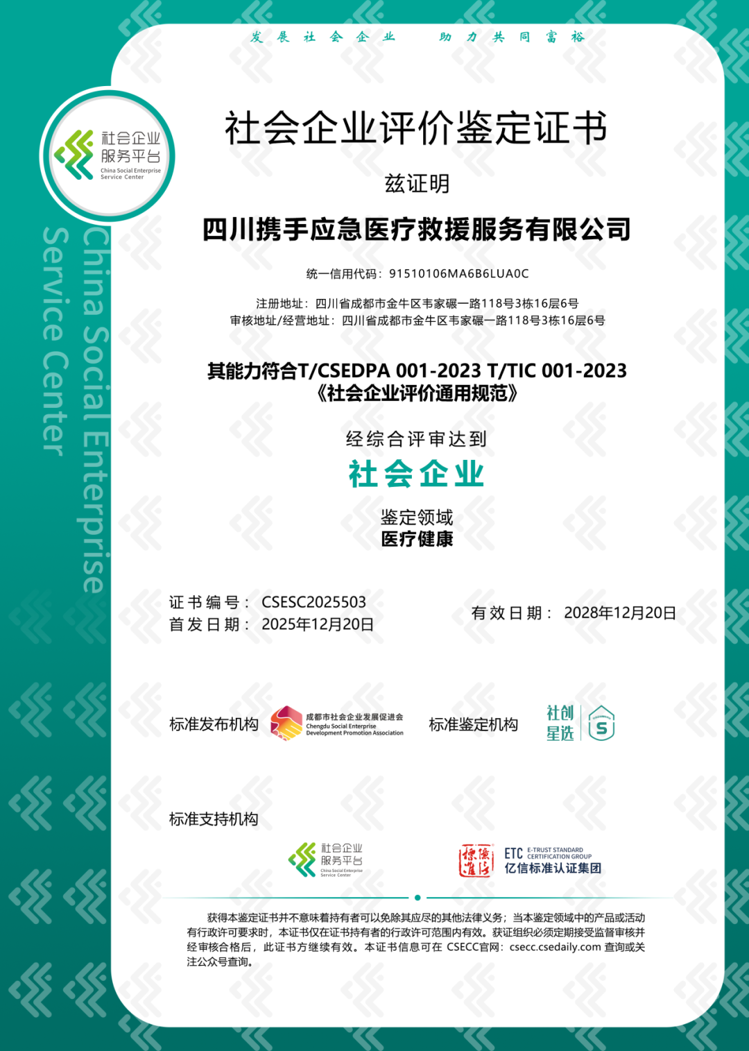 在“共卫生命,携手同行”的前提下,我们本着社会救助原则成立了“携手应急医疗救援队”,并于2022年和2025年2次被评定为“中国好社企”,2024年获得向善企业“向光奖”。
