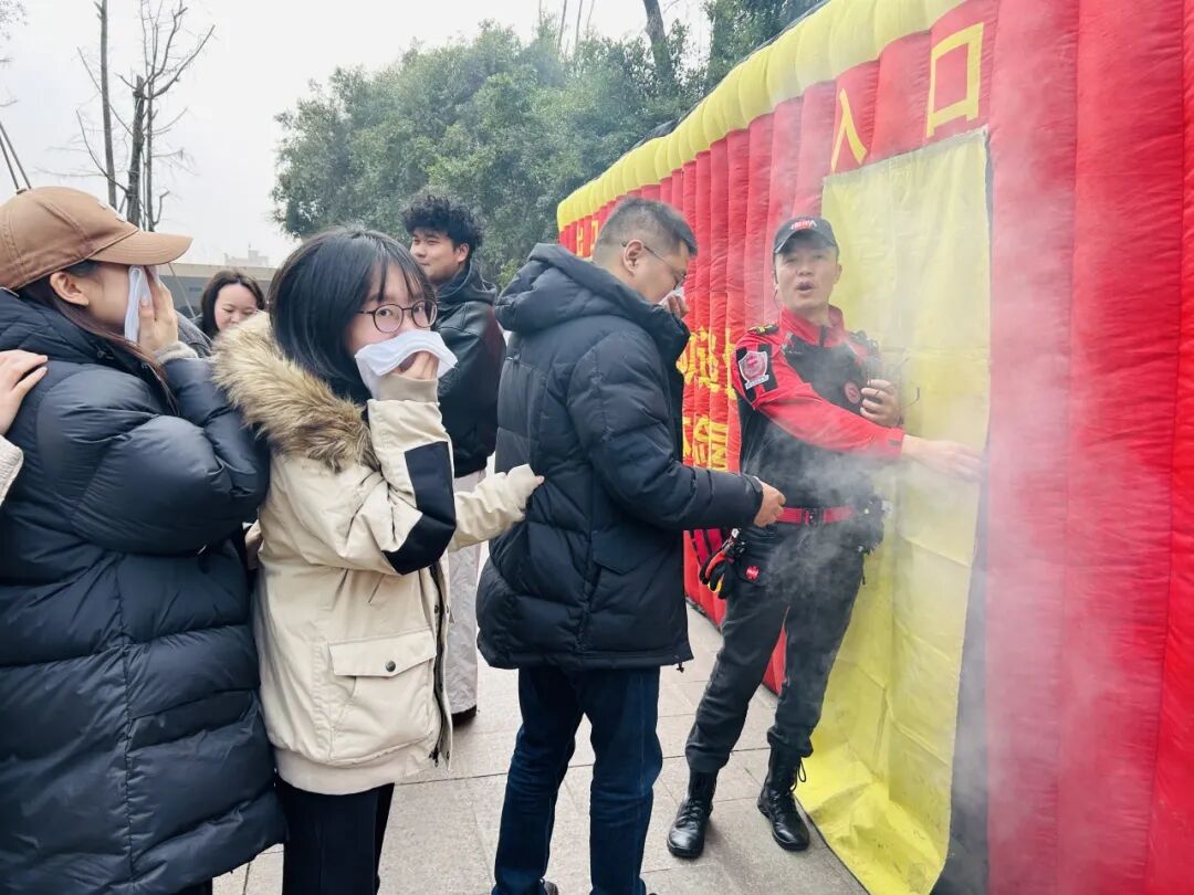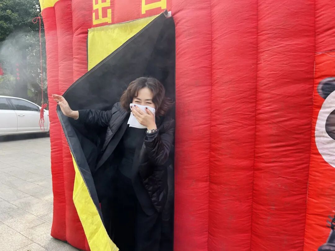演练尾声,组织全员体验烟道逃生帐篷,让参与人员在模拟的浓烟密闭环境中,实操演练弯腰低姿、湿捂口鼻等核心逃生技巧。沉浸式的体验让逃生知识转化为实操能力,进一步夯实了全员的火场逃生基本功。