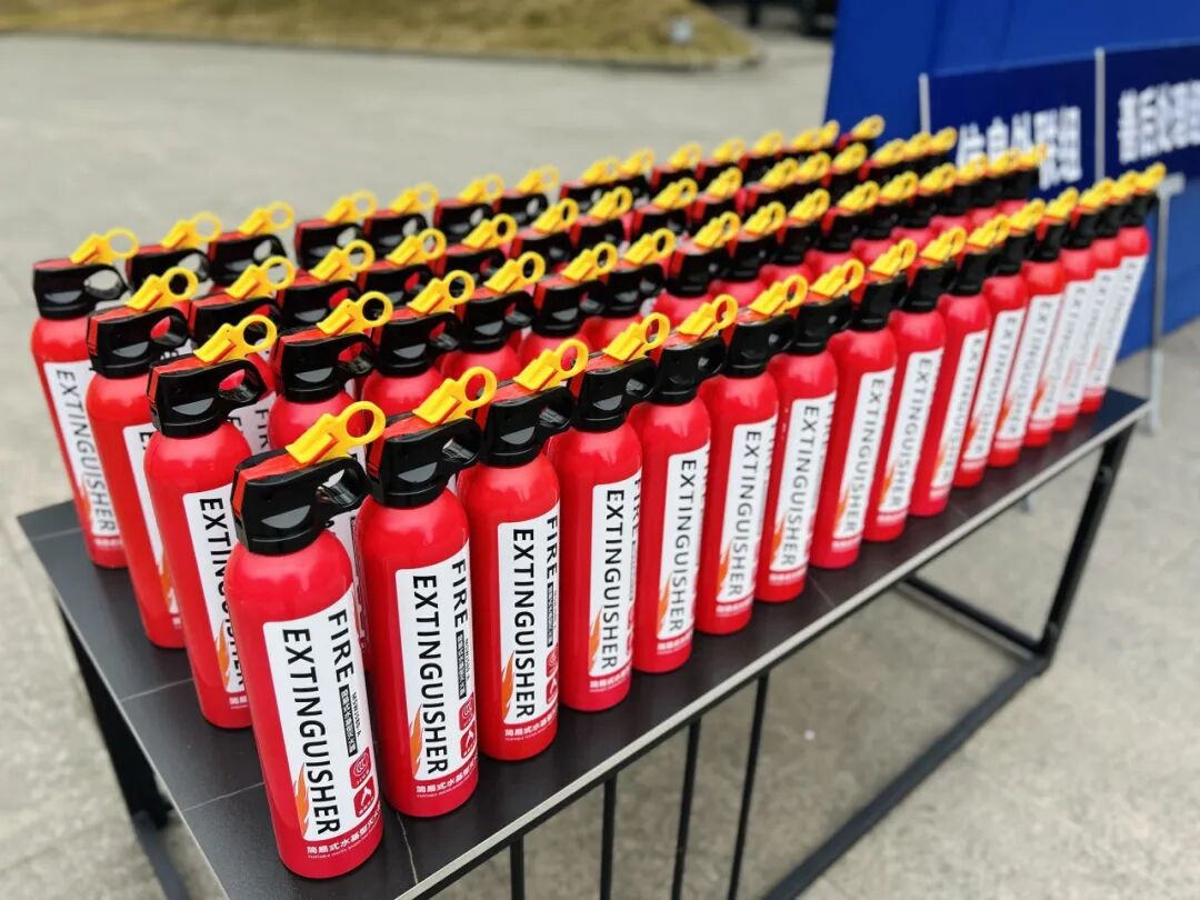 灭火器使用实操体验区,员工逐一对灭火器按“提拔握压”流程,进行实操体验,熟悉每个环节并考核。同时,使用水基灭火器和模拟火焰也充分体现了环保的教学理念。