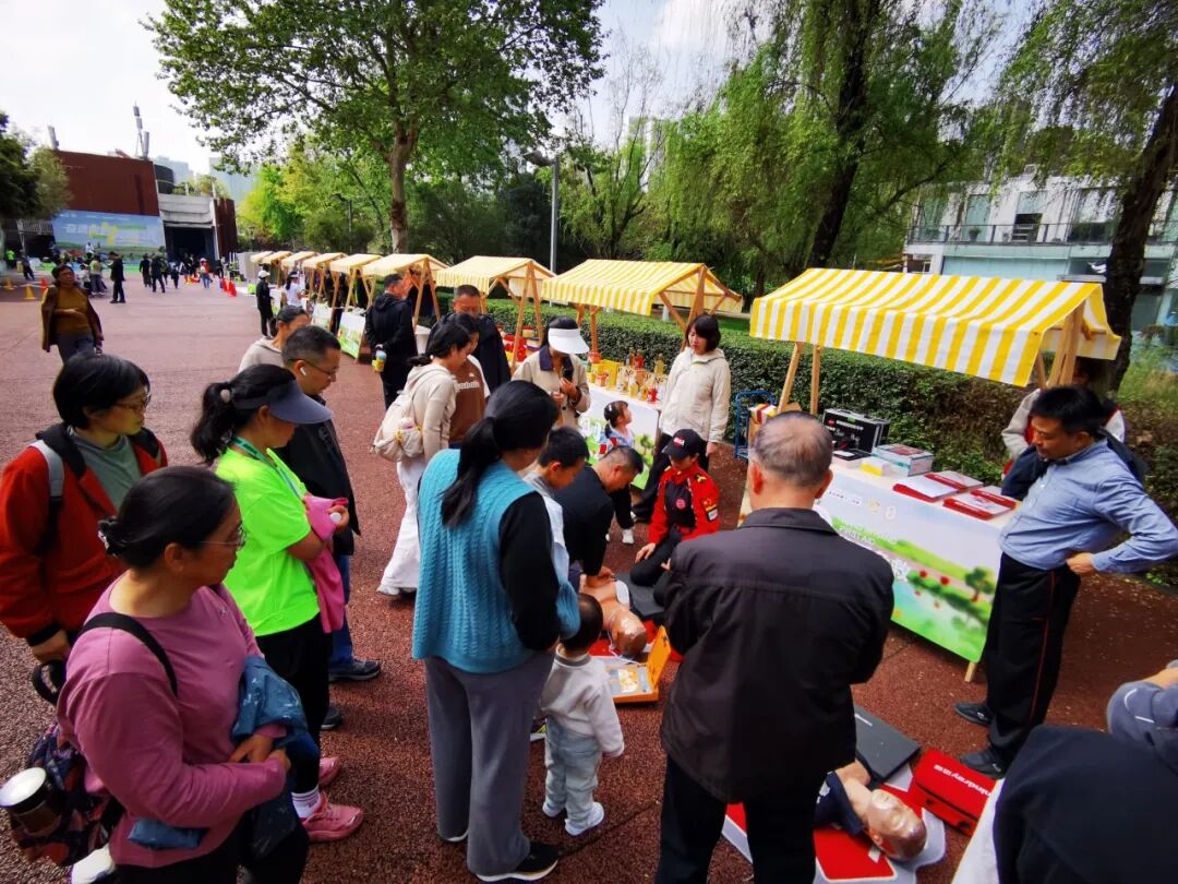 在东湖公园西门广场的主题市集上,携手急救的科普展位成为“运动赶集”的一大亮点。展位上,“携手急救”标识与“奋勇向前”主题背景交相辉映,吸引众多市民驻足。